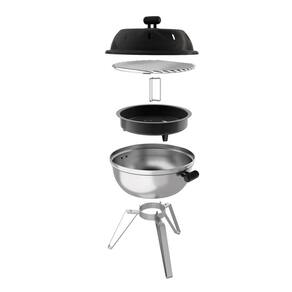 A Grelha tem duas faces: lado convencional liso oulado com canaletas inclinadas, faz grelhados para 8 pessoas. Recolhe a gordura na base, evita labaredas com a grelha de canaletas e pode funcionar aberto. Porta-carvão com especial dispositivo braseador facilita o preparo da brasa. Corpo e tampa em alumínio, grelha e tripé em inox.
