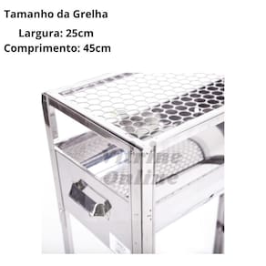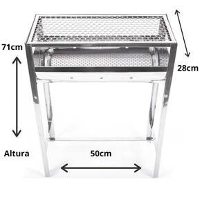 A churrasqueira possui um comprimento de 50 cm e uma largura de 28 cm. Quando montada, suas dimensões aproximadas são de 71 cm.