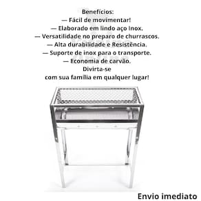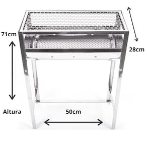 Com medidas aproximadas de 50 cm de comprimento, 28 cm de largura e 71 cm de altura montada, essa churrasqueira oferece versatilidade no preparo de churrascos. A grelha é fabricada em aço inox, o que garante maior durabilidade e facilidade na hora da limpeza. Além disso, possui um cabo de madeira para facilitar o transporte.