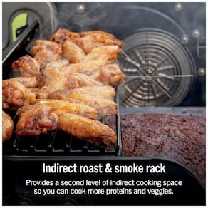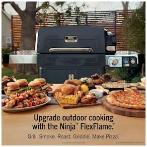 A churrasqueira Ninja FlexFlame é um sistema de cocção externa 5 em 1 que permite grelhar, defumar, assar, usar chapa (griddle) e preparar pizzas no mesmo equipamento. A combinação de queimadores a gás propano com controle eletrônico alimentado por energia elétrica oferece ajuste preciso de temperatura em ampla faixa, adequada tanto para selagens em alta temperatura quanto para defumação em baixa cocção.
