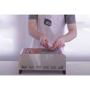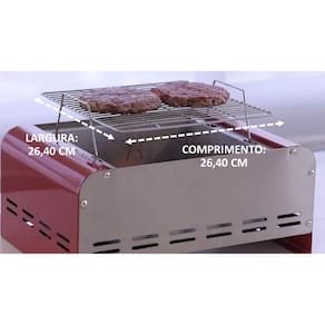 Durável e fácil de limpar, tem lateral em inox e caixa do carvão removível;