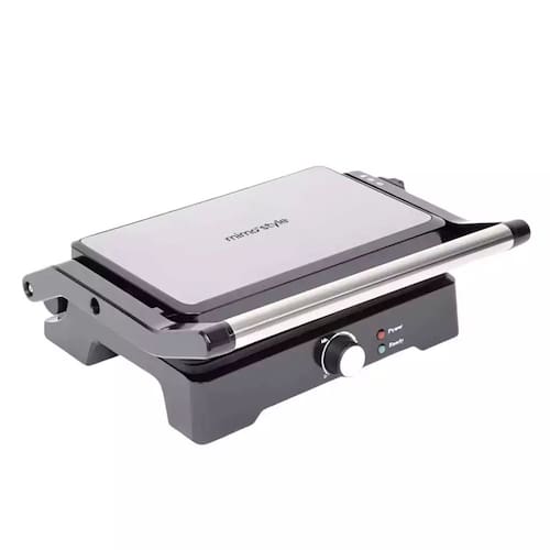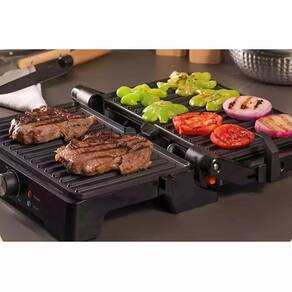 Churrasqueira e sanduicheira grill com design em aço inox, placas antiaderentes, grelhas duplas onduladas e chapas ajustáveis. Ideal para diversos alimentos.Termostato regulável