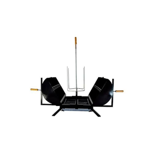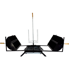 Churrasqueira de tambor modelo Fogo de Chão, feita em tambor aberto, com dois espetos centrais, para fazer churrasco diretamente no chão. Muito usada para assar costelas e peças grandes de carnes diversas com lenha, diretamente no chão.