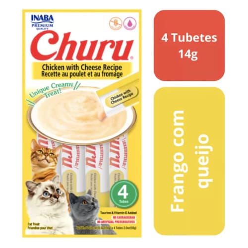 Churu Frango com Queijo é um petisco cremoso para gatos, feito com ingredientes aptos para o consumo humano. Não contém grãos, corantes ou conservantes artificiais. É enriquecido com Taurina, Vitamina E e Extrato de Chá Verde.