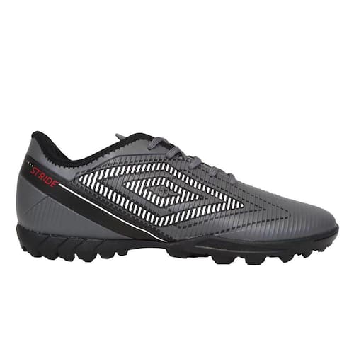 A chuteira society Umbro stride vem com texturas alternadas em alto e baixo-relevo do tipo “canelado”, garantindo um toque diferenciado que aumenta o grip e o efeito no momento do chute. Cabedal (parte superior do calçado) construído em material laminado com diamante duplo estilizado na lateral. Conta com forro interno em poliéster e palmilha super macia em EVA. Possui solado de society HG todo em borracha. A sola da Umbro stride foi especialmente desenvolvida para garantir tração e estabilidade em superfícies sintéticas. Com cravos multidirecionais e estrategicamente posicionados, a chuteira proporciona aderência máxima ao solo, permitindo mudanças de direção rápidas e ágeis, bem como arrancadas explosivas.