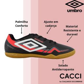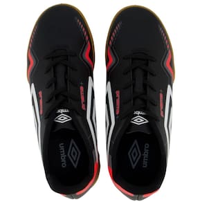 O cabedal (parte superior do calçado) é construído em material sintético de fácil manutenção com textura suave e acabamento laminado. Possui arte gráfica com cores contrastantes em serigrafia, Diamante Umbro na lateral, forro interno em poliéster e palmilha macia em EVA com tecido forrado. O solado de futsal é em blenda de TPU com PVC para maior durabilidade e firmeza