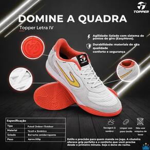 - Nome: Chuteira Futsal Topper Letra IV Unissex - Gênero: Masculino - Tipo: Futsal - Indicado para: Jogo - Material: Têxtil e Sintético - Trava: Sem Trava - Solado: Borracha antiderrapante para quadras indoor e outdoor - Peso do Produto: 323 g (O peso do produto varia de acordo com a numeração) - Garantia do Fabricante: Contra Defeito de Fabricação - Origem: Nacional - Marca: Topper