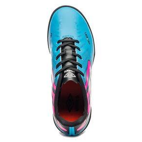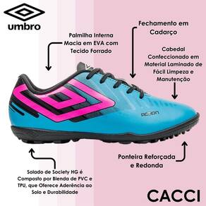 Cabedal confeccionado em material laminado de fácil limpeza e manutenção. Possui grafismos em “layers” com aplicação de verniz incolor sobre as artes, Diamante Umbro em destaque na lateral, assinatura do modelo na parte frontal e palmilha interna macia em EVA com tecido forrado. O solado de society HG é composto por blenda de PVC e TPU, que oferece aderência ao solo e durabilidade.