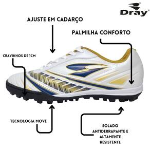 Com as chuteiras Dray com Tecnologia MOVE e Costura Frontal, você estará pronto para dominar o campo, com controle aprimorado e movimentação ágil que fazem a diferença no seu jogo. Escolha a qualidade e o estilo da Dray para elevar seu desempenho no futebol.