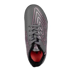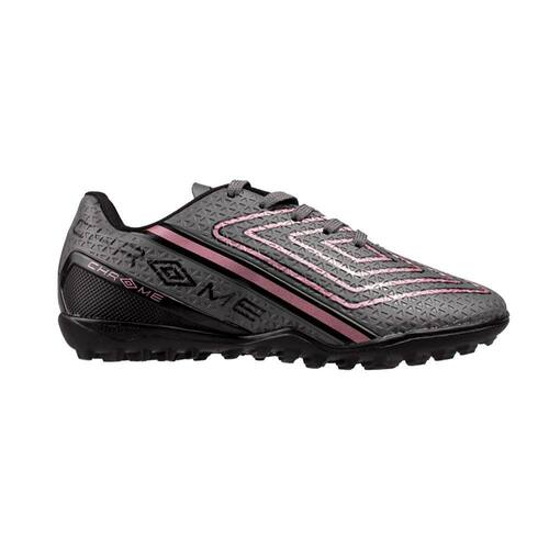 A Chuteira Umbro Chrome é para o jovem que sabe o que faz com a bola. Seu cabedal é confeccionado em material sintético e de poliéster. Seu solado é feito de borracha, com travas baixas; Seu fecho é em cadarço e forro em poliéster. Seu design é predominante na cor cinza e com detalhes em preto. Não perca tempo e garanta já a Chuteira Umbro Chrome para seu pequeno!