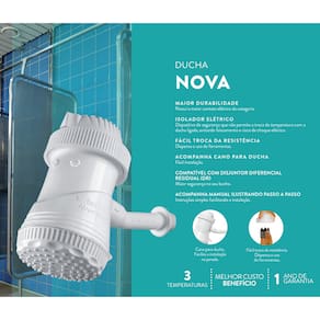 Única ducha no mercado com 2 anos de garantia, acompanha Cano Adaptador como acessório que facilita a instalação na parede. Design funcional e compacto, possibilita fácil substituição da resistência sem a necessidade de ferramentas ou técnicos especializado.