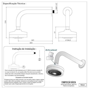 ESPECIFICAÇÃO TÉCNICA: - Garantia 5 anos - Bitola 1/2 DN15 - Material: METAL - Posição de Instalação: Parede - Altura: 21,5 cm - Largura: 12,5 cm - Profundidade: 30 cm - Pressão Mín.: 1,5 m.C.A - Pressão Máx.: 40 m.C.A - Vazão Mín.: 2 l/m - Vazão Máx.: 16 l/m - Temperatura máxima da água: 70º C - Braço: 25 cm - Sistema de funcionamento: Autolimpante Marca: Shophidraulica Ean: 7894248328735