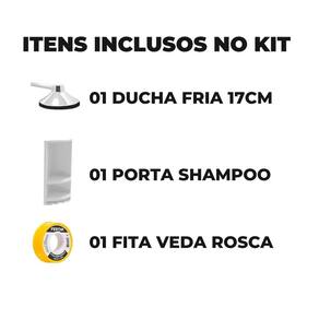 ITENS INCLUSOS 01 Chuveiro Ducha Fria Redondo 01 Porta Shampoo 01 Fita Veda Rosca12mm x 5m Marca: Não Informado