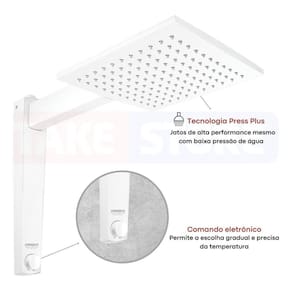 - Compatível com aquecimento solar, aquecimento a gás e aquecimento por acumulação - Possui comando eletrônico, que permite a escolha gradual e precisa da temperatura, oferecendo um banho confortável em todas as estações do ano - Conta com a resistência Loren Ultra, de alta performance e longa duração. O exclusivo cartucho garante uma troca rápida e segura - Tecnologia press pluss: jatos de alta performance mesmo com baixa pressão de água