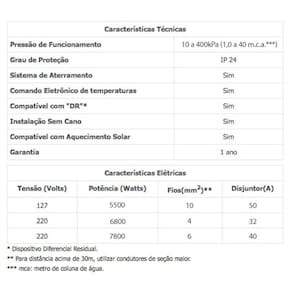 <strong>Tensão</strong> (220 Volts) - <strong>Potência</strong> (6800 Watts) - <strong>Fios</strong> (4 mm²)** - <strong>Disjuntor</strong> (32 A)<br>