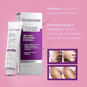 CICATRICURE GEL PARA CICATRIZES E ESTRIAS Pele com cicatrizes e estrias. Gel formulado especialmente para hidratar e melhorar a pele com cicatrizes. Cicatricure Gel é indicado para cicatrizes e estrias, pois melhora a aparência da pele graças ao exclusivo composto Regenext, que repara e hidrata a pele, uniformizando a cor e a textura da cicatriz ou estria em relação ao resto da pele. Modo de usar: Aplique generosamente na pele 3 vezes ao dia com uma leve massagem, por um período de 3 a 6 meses. A aplicação sobre cicatrizes recentes deve ser feita somente sob recomendação médica. Além de cicatrizes, o uso contínuo de Cicatricure Gel também reduz estrias.