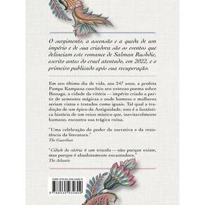 O surgimento, a ascensão e a queda de um império e de sua criadora são os eventos que delineiam este romance de Salman Rushdie, o primeiro a ser publicado após o atentado sofrido pelo autor em 2022. “Neste exato lugar uma grande cidade surgirá, para maravilhar o mundo, e seu império há de durar mais de dois séculos. E tu […] lutarás para que nunca mais outras mulheres sejam queimadas dessa maneira e para que os homens vejam as mulheres de um jeito novo”, declara a deusa Parvati a Pampa Kampana, uma menina de nove anos que acabara de ver a mãe e outras mulheres se entregarem à fogueira após perderem os maridos para a guerra. Maldição e bênção caminham lado a lado: ao se tornar órfã em terras destroçadas, a criança se vê dominada pelos poderes da divindade, que começa a operar através dela. É dessa forma que Bisnaga, a cidade da vitória, nasce. A partir dos desejos de uma jovem indefesa, erguem-se os muros de um novo e próspero império. Seus cidadãos brotam da terra, suas histórias e memórias são sussurradas segundo a imaginação de Pampa Kampana, assim como suas conquistas e derrotas também são arquitetadas pela profeta — mas toda narrativa tem um jeito de fugir de seu autor. Com o passar dos anos, governantes vêm e vão, batalhas são vencidas e perdidas, e o próprio tecido da cidade se torna uma tapeçaria cada vez mais complexa. As fortalezas de Bisnaga, então, são comprometidas pela ambição e pela arrogância de quem está no poder. Narrada com o imaginário e a acidez característicos de Salman Rushdie, Cidade da vitória remete aos antigos poemas épicos para evidenciar as contradições do mundo. Uma saga de amor, aventura e mito que é em si uma prova do poder da ficção. “Cidade da vitória é um triunfo — não porque existe, mas porque é absolutamente encantadora.” — The Atlantic “Uma celebração do poder da narrativa e da resistência da literatura.” — The Guardian Ean: 9788535934809
