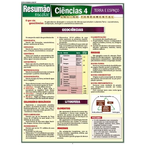 Neste Resumão você encontra os conceitos básicos das geociências e também: litosfera (minerais, rochas, camadas da terra, placas tectônicas e processos geológicos), hidrosfera (águas salgada e doce) e atmosfera (formação, organização, efeito estufa, tempo, ventos e tempestades). Na segunda parte, os princípios fundamentais das ciências do espaço e um guia básico do Universo e do Sistema Solar, com informações sobre cada planeta.