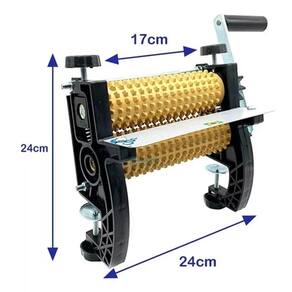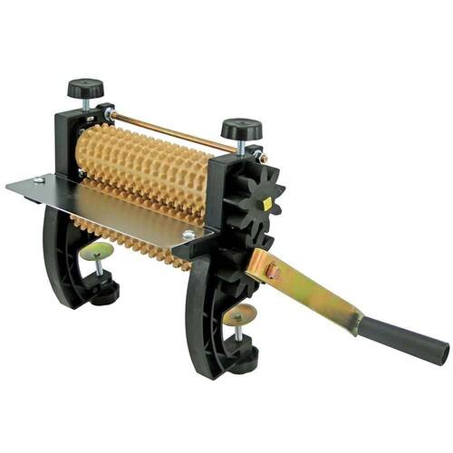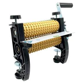 INFORMAÇÕES GERAIS DO CILINDRO AMACIADOR EM NYLON - Cor: Laterais e engrenagens pretas, rolos marrons e manivela dourada. - Material: Nylon. - Regulagem: A distância entre os cilindros pode ser regulada entre 0 mm a 10 mm. - Fixação: Por morsas, adaptando-se em diversos tamanhos de mesa. - Tamanho dos rolos: 17 cm de largura. - Funcionamento: Manual. - Pode ser em sua residência ou estabelecimento comercial.