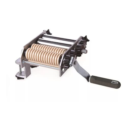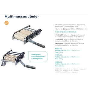 O manuseio e corte de massas fica muito mais prático e preciso com o cilindro multimassas Junior. Especial para massas, pães, lasanhas, pastéis, espaguete, talharim, pizza e muito mais. O rolo em aço possui revestimento cromado de 14,5cm de comprimento, com 3,8cm de diâmetro, ainda conta com regulagem de pressão com segurança e rapidez, e vem acompanhado de raspadores para não grudar a massa. A manivela é desmontável, facilitando o armazenamento e limpeza. Sua estrutura possui laterais em alumínio e engrenagens em nylon, e a fixação da base é com morsa regulável.
