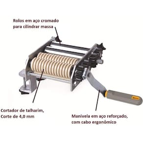 O manuseio e corte de massas fica muito mais prático e preciso com o cilindro multimassas Junior. Especial para massas, pães, lasanhas, pastéis, espaguete, talharim, pizza e muito mais. O rolo em aço possui revestimento cromado de 14,5cm de comprimento, com 3,8cm de diâmetro, ainda conta com regulagem de pressão com segurança e rapidez, e vem acompanhado de raspadores para não grudar a massa. A manivela é desmontável, facilitando o armazenamento e limpeza. Sua estrutura possui laterais em alumínio e engrenagens em nylon, e a fixação da base é com morsa regulável.