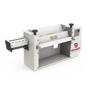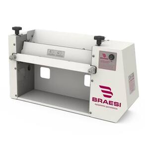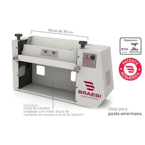 Características Técnicas: Estrutura aço inox Chapa com pintura epóxi Eixos apoiados em rolamentos Laminadores revestidos teflon Raspadores plásticos Motor 1/4 HP Medida rolo: 38cm x 5cm Abertura mínima: 1mm Abertura máxima: 8mm Dois reguladores Consumo médio: 0,26 Kw/h Potência: 250W