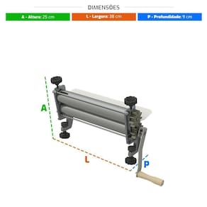 CARACTERÍSTICAS PRINCIPAIS- Engrenagens em nylon;- Firenze com laterais em ALUMÍNIO;- Cilindros laminadores de 2 x 300mm, revestidos em cromo duro;- Lâmina de apoio em aço com pintura epóxi.- Peso Liquido: 2,4 Kg- Peso Bruto: 2,9 Kg- Medida Externas: 38,5cm A x 24,5cm L x 14,5cm P- Medida Embalada: 40cm A x 26cm L x 16cm P Perguntas Frequentes:- Equipamento vem montada?Sim, ela vem montada. - O produto é novo?Sim, o produto é novo, lacrado na caixa. Produto: Cilindro | Utensílio para Preparação: 1 | Cor: Cinza | Utensílio Indicado: 1