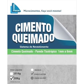 Cimento Queimado Parede Max Pisos Cinca Claro 20kg Cimento Queimado Parede Tixotrópico Maxpisos Cinza Claro 20kg produto em pó, ao adicionar água torna-se argamassa tixotrópica contendo cimento portland cargas minerais e aditivos. Fácil aplicação com simples rolo de pintura e alisar com desempenadeira de aço preferencia inox com cantos arredondados acabamento liso sem lixar alisado com desempenadeira efeito manchado do cimento industrial sem lixamento sem pó sem fissuras sem juntas ideal para aplicar em paredes, tetos, espelho de escada, banheiro, concreto, madeira, cerâmica, porcelanato, porcelanato líquido, epóxi. Uso interno e externo incluso 1000g Resina Multiúso acrílica acabamento fosco, acetinado e brilhante. Marca: Max Pisos