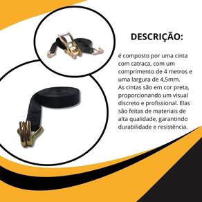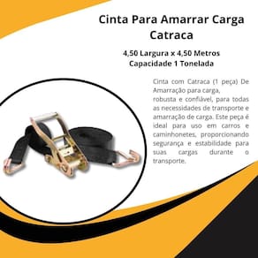 Cinta catraca para carga 1ton 4,5 metros caminhão amarração Cinta com catraca 1 peça de amarração para carga de até 1 tonelada, robusta e confiável, para todas as necessidades de transporte e amarração de carga. Este kit é ideal para uso em carros e caminhonetes, proporcionando segurança e estabilidade para suas cargas durante o transporte.
