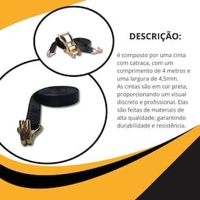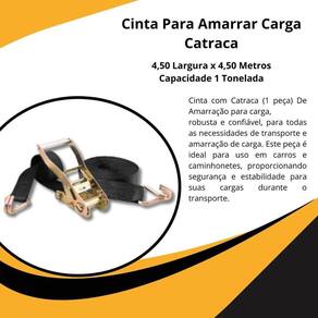 Cinta catraca para carga 1ton 4,5 metros caminhão amarração Cinta com catraca 1 peça de amarração para carga de até 1 tonelada, robusta e confiável, para todas as necessidades de transporte e amarração de carga. Este kit é ideal para uso em carros e caminhonetes, proporcionando segurança e estabilidade para suas cargas durante o transporte.