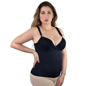 Possui abertura frontal de zíper e três colchonetes internos, para reforçar o fecho e rendas do bojo.