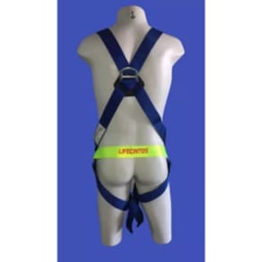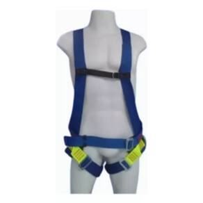 Descrição do produto: Fita primária na cor azul, e amarela neon composição: poliéster de 45mm de largura. Fita secundária na cor preta; composição: poliéster de 25mm. Dispõe de 1 ponto de ancoragem dorsal em meia argola estampada de aço. Equipado com 3 fivelas de chapa de aço estampada sem pino para regulagem, sendo 1 na cintura e 2 nas pernas, para ajuste no peito 1 fivela em “D” 25mm niquelada. Tamanho ajustável. Utilização do produto: Utilizado em atividades a mais de 2 metros de altura do piso, nas quais haja risco de queda do trabalhador.