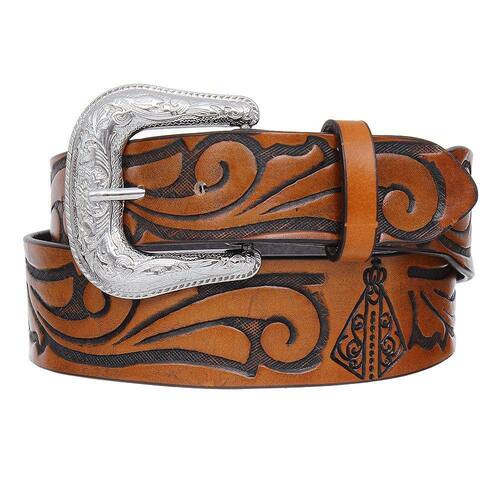 Cinto Cow Way fabricado em couro na cor Marrom com 4,5cm de largura, possui bordados (entalhados) no couro com detalhes de Nossa Senhora Aparecida e fivela de metal removível.