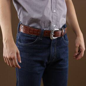 Cinto com a clássica qualidade Cow Way fabricado em couro duplado e costurado de crocodilo na cor Marrom com 4cm de largura, possui fivela de metal removível com detalhes florais. Uma peça realmente bonita e que não pode faltar em seu guarda roupa!