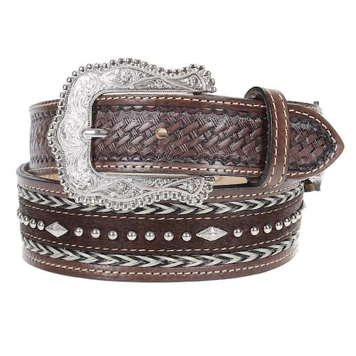 Cinto Paul Western fabricado em couro com detalhe em pelo na com Marrom com 4,5cm de largura, possui detalhes em rebites de metal, tranças em nylon e fivela removível de metal trabalhada.