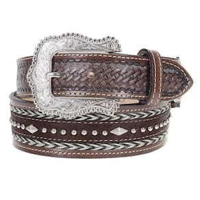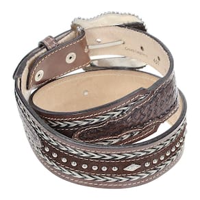 Cinto Paul Western fabricado em couro com detalhe em pelo na com Marrom com 4,5cm de largura, possui detalhes em rebites de metal, tranças em nylon e fivela removível de metal trabalhada.