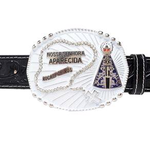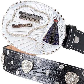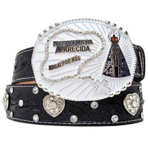 Cinto Couro Feminino Fivela Nossa Senhora De Aparecida Terço Strass Boiadeira Muladeiro - Preto - 105