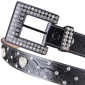 Cinto Couro Feminino Fivela Quadrada Strass Para Dia a Dia Country Com Aplicação de Coração - Preto - 85