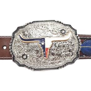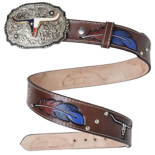 Cinto de Couro Rodeio Western Fivela Removivel Touro Botão de Pressão Estampa de Pena Alto Relevo - Marrom - 85