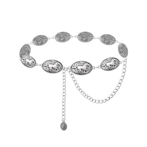 Cintos de corrente de prata de cavalo para roupas ocidentais - ?Observe o tamanho? Cintos ocidentais para mulheres, conchos de metal envolvem totalmente a cintura 71,1 cm (P) / 81,3 cm (M) / 91,4 cm (G), ajuste de cintura até 89 cm (P) / 101,6 cm (M) / 114,3 cm (C) pela corrente de extensão. - ?Encantador e requintado? Cinto de cowboy para mulheres, com detalhes complexos e materiais de alta qualidade. Este cinto é mais do que apenas um acessório; é uma peça de declaração que adiciona um toque de sofisticação a qualquer conjunto. - ?Adequado para qualquer ocasião? Cinto Concho para mulheres, fica incrível com qualquer roupa. Excelente para combinar com seus vestidos, saias, camisas, jeans, calças de couro, roupas de biquíni, em diferentes ocasiões, como trabalho, compras, viagens, festas, carnaval, encontros, boates. - ?Estável e confortável? Roupa de vaqueira feminina, nosso cinto de vaqueira garante um ajuste estável e confortável que permanece no lugar durante todo o dia. Se você estiver dançando em um show ou simplesmente curtindo uma reunião temática country, este cinto é seu companheiro confiável. - ?Presente incrível para ela? Cinto de rodeio para mulheres, será um presente de aniversário maravilhoso, presente de formatura, presente de aniversário de casamento, presente de férias, presente de dia dos namorados, presente de dia das mães, presente de Páscoa, presente de Ação de Graças, presente de Natal.