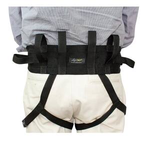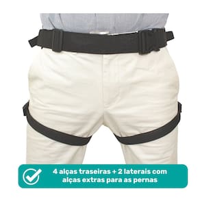 Diferente do modelo simples, este conta com alças extras com presilhas, que passam pelas pernas do paciente, distribuindo melhor o peso e impedindo que o cinto suba durante a movimentação.