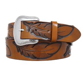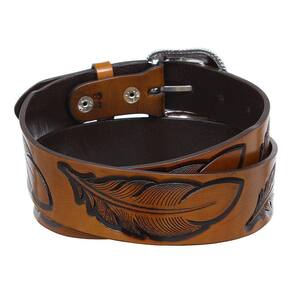 Cinto Cow Way fabricado em couro na cor Marrom com 4,5cm de largura, possui bordados (entalhados) no couro e fivela de metal removível.