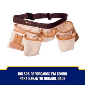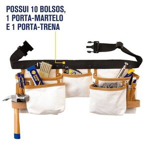 O Cinto para Ferramentas IW14086 possui 10 bolsos, 1 porta-martelo e 1 porta-trena.