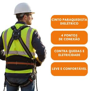 Cinturão paraquedista dielétrico com 4 pontos de conexão. Leve e confortável. Ideal para atividades de trabalho em altura com eletricidade.