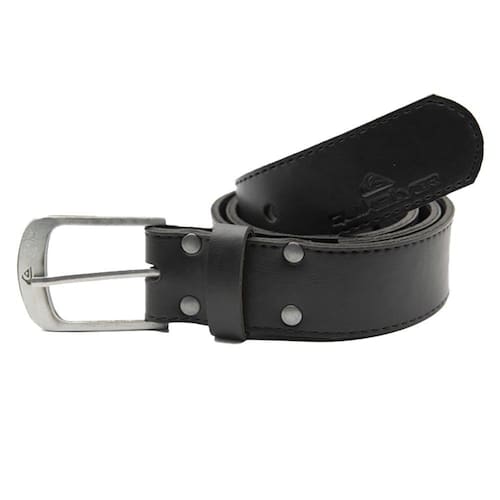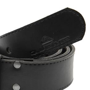 Cinto Quiksilver com corpo em manta de PVC com poliéster, fivela metálica com logo em baixo relevo, alta frequência próximo a ponta do cinto e etiquetas personalizadas.