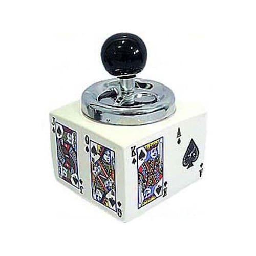 Cinzeiro - Cartas Grande (Tema Baralho Cartas) - Unitário Cinzeiro retro decorativo com tampa flexível que isola as cinzas e bitucas de cigarro reduzindo o odor deixado por elas. Material: Cerâmica / Alumínio Medida Aprox.(AxCxL):13x9,5x9,5cm Peso Aprox.: 345g