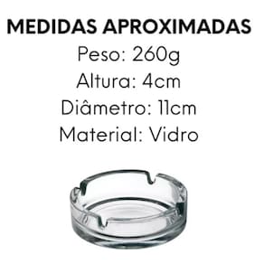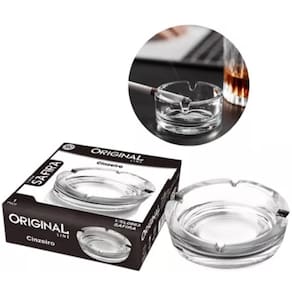 cor transparente do cinzeiro adiciona um toque de modernidade e elegância, combinando perfeitamente com qualquer ambiente.Seja para uso diário ou para uma ocasião especial, este cinzeiro de vidro é a escolha perfeita.Alem do cinzeiro, a embalagem inclui uma caixa, tornando-o uma excelente opção para presente.MEDIDAS APROXIMADASPeso: 260gAltura: 4cmDiâmetro: 11cmMaterial: VidroLinha SAFIRAModelo EM VIDRONome Do Desenho CinzeiroForma RedondaCom tampa Não Marca: Original Glass