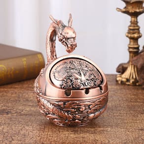 Material: liga leve Peso: 360 g Tamanho: 11 x 11 x 15 cm Design elegante de dragão — apresenta um dragão chinês intrincadamente esculpido enrolado em um cinzeiro esférico, criando uma estética ousada e tradicional com profundo simbolismo cultural. Construção em liga — Feita de material de liga durável que oferece resistência ao calor e uso duradouro, mantendo uma sensação premium e um acabamento antigo. Tampa à prova de vento — Equipada com uma tampa giratória para evitar que as cinzas voem e minimizar os odores, tornando-a ideal para ambientes internos e externos para fumar. Funcional e decorativo — Não é apenas um cinzeiro, mas também um item de coleção decorativo que adiciona um toque de sofisticação a desktops, bares, lounges ou salões de chá. Compacto e atraente — Medindo 11x11x15 cm e pesando 360g, este cinzeiro economiza espaço e impressiona visualmente em qualquer superfície.