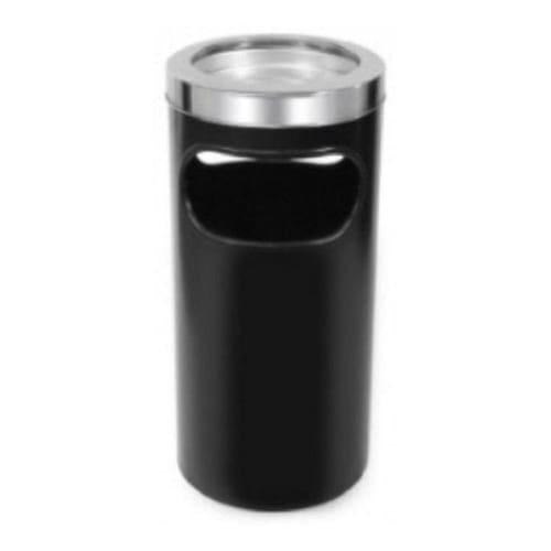 Cinzeiro Lixeira Plástico Com Aro Em Aço Inox C6I Cinzeiro lixeira plástico com aro em aço inox. Injetado em plástico polipropileno PP , aro em aço inox, furos laterais para jogar lixo e cinzeiro na parte superior da lixeira. Cores disponíveis: preto, Medidas: 530mm altura x 240mm diâmetro .