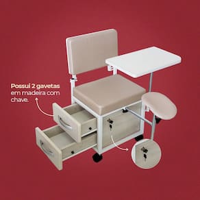 - conforto superior: estofado macio e suporte ergonômico para longas sessões. Espuma densidade d 28. - estrutura robusta que garante uma vida útil prolongada, com suporte de até 120 kg distribuídos uniformemente - praticidade: mesa articulável com regulagem de altura. Apoio de pés com regulagem de altura e inclinação, e removível. - possui duas gavetas com chave e rodinhas que facilitam na movimentação. - estilo moderno: transforme seu ambiente de trabalho em um espaço moderno e eficiente com a cirandinha evolux - se você busca excelência no atendimento e conforto em seu trabalho, a cirandinha evolux é a escolha ideal Ideal para: - manicures e pedicures - salões de beleza - clínicas de estética